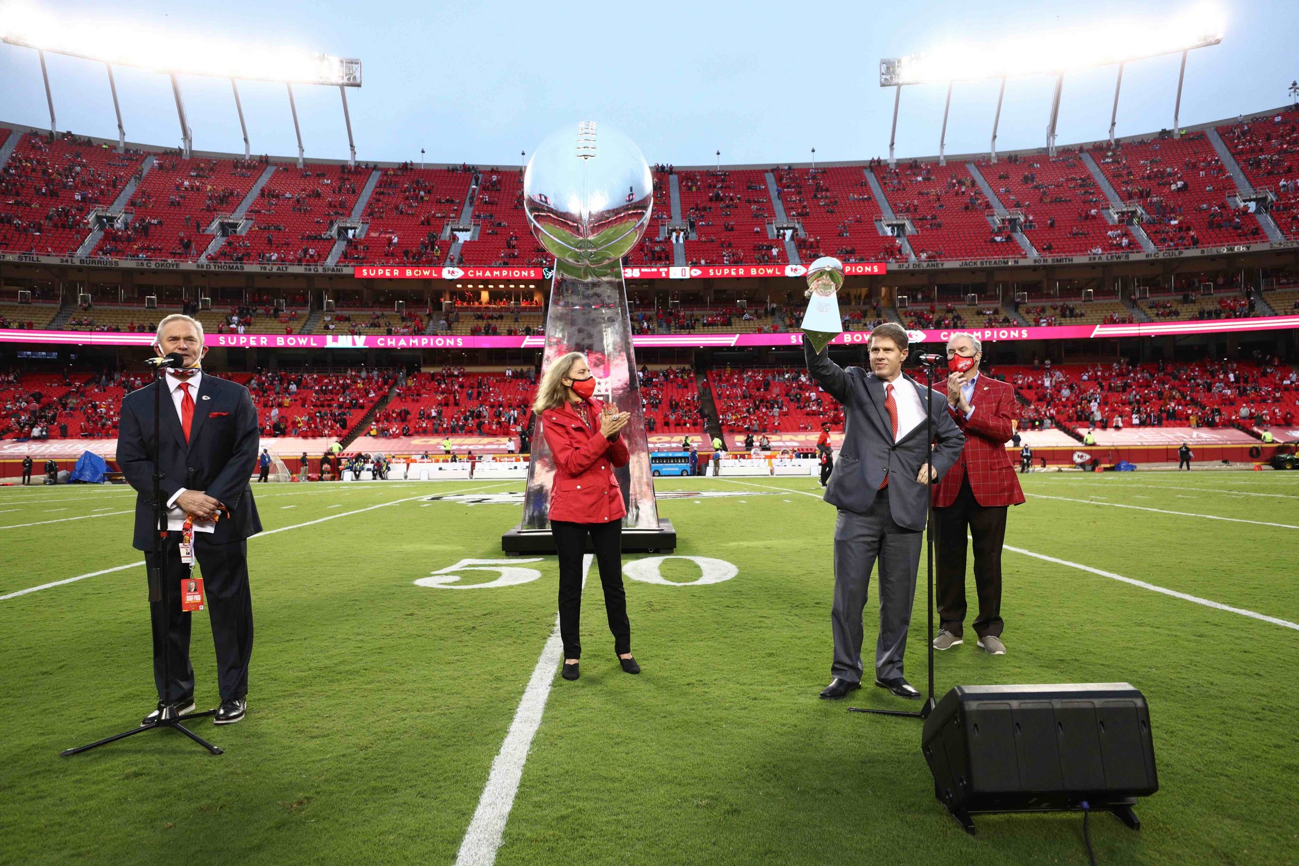 Players and members of the franchise received their championship rings during a private gathering at the stadium in early September, but, for this public celebration, a large-scale version of the Lombardi trophy was placed at the 50-yard line as the backdrop for speeches given to the 15,895 fans in attendance. Among the dignitaries was Kansas City Chiefs Chairman/CEO Clark Hunt, who hoisted the Lombardi trophy in the air and spoke prior to the unveiling of the Super Bowl Champions banner.