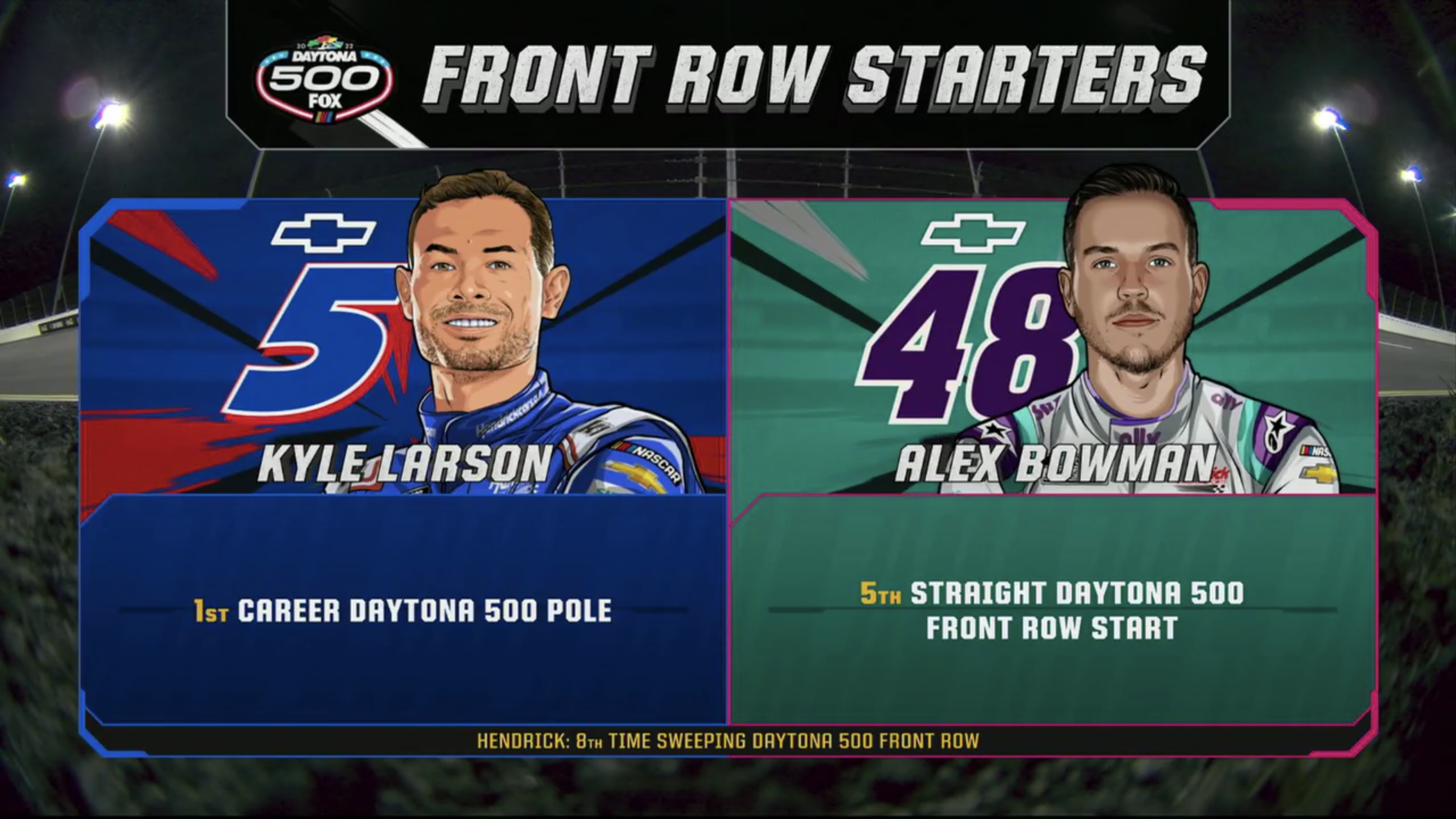 Fans will also notice a new graphics package on Sunday’s broadcast. Replicating the set of elements that were introduced during Super Bowl LIV in 2020, this more dynamic approach incorporates movement and creativity. For example, drivers will have artistic drawings of themselves, which are similar to the “hero” graphics used for the NFL.