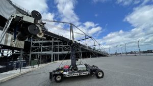 This massive event wouldn’t be a spectacle without the hours of shoulder programing. Bringing fans closer to the asphalt, the physical set of the prerace and postrace shows have moved from the concourse to a spot in the old victory lane. Utilizing the same set from the Clash, Fox Sports’ Director, Remote Studio Operations Rob Mikulicka and Manager, Remote Studio Operations Amy Burns are supervising the activation in front of the start/finish line. The main feature of this structure is two mechanical arms developed by Filmwerks. These arms provides the ability to rise and collapse quickly.