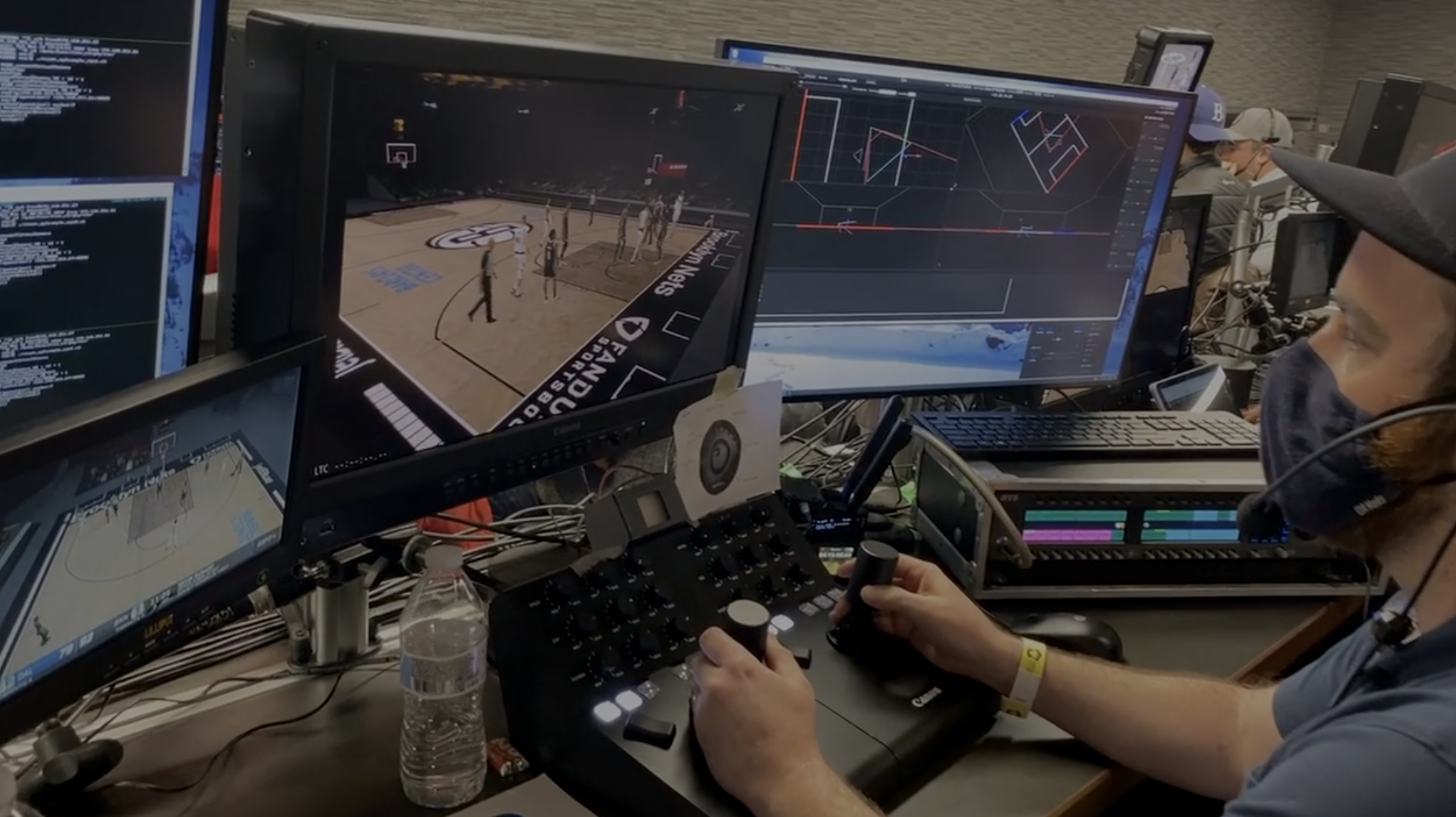 ESPN brought in drone pilots in to operate the system, which has a joystick that is similar to those of robotic and cabled camera systems. “We brought drone operators to [Barclays] for about four games so they could get comfortable with flying it,” Placey says. “Over the course of those four games, they got better and better.”