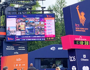 At key waypoints, SMT (SportsMEDIA Technology) had 18 LED displays set up across the grounds and course, displaying content unique to various locations, including the Javits Center, start line, and finish line. Five on-course displays were located at miles 8, 16, 20, 23 and 26. In addition, two LED track boards greeted runners with SMT-produced race content. A 50-foot ribbon board was also suspended from the photo bridge and displayed runner times for each of the waves.