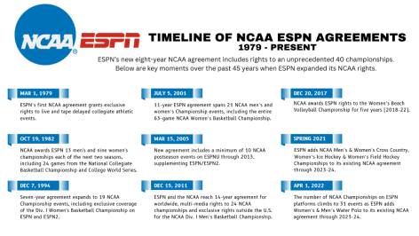 In total, more than 2,300 hours of championships will be presented on ESPN’s linear and digital platforms annually, with more than 800 hours of NCAA championships on ESPN linear networks each year. The agreement also includes enhanced broadcast sponsorship and footage rights for ESPN across its full portfolio of championships and platforms.