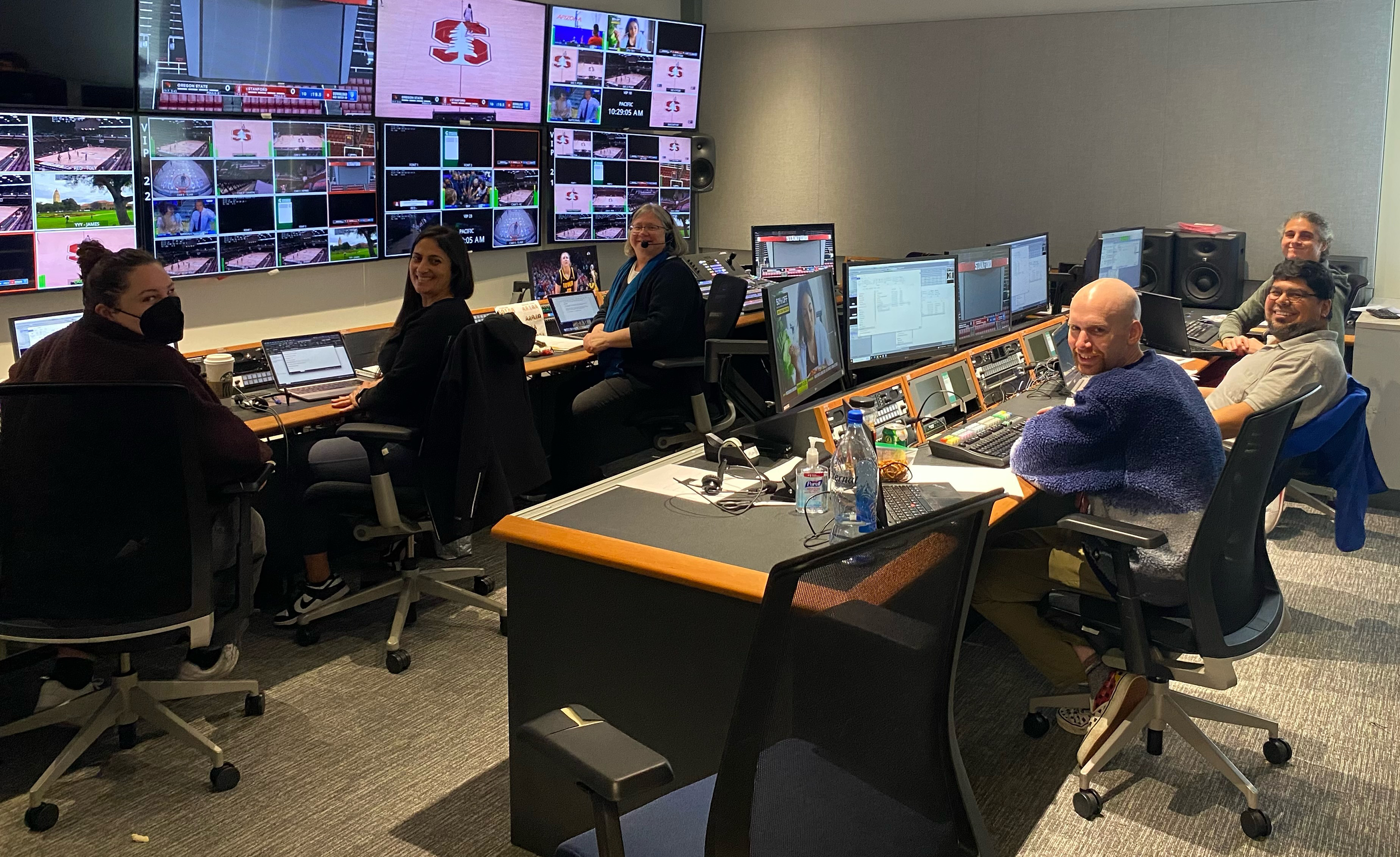 On Jan. 21, Stanford University’s Tara VanDerveer became the winningest basketball coach in NCAA history. That game aired on Pac-12 Networks and was produced from one of nine control rooms designed for live REMI-style production at the San Ramon facility. Front row, from left: Associate Director Christine Assily, Producer Zohra Ziani, and Director Lori Brooks. Back row, near to far: Senior Graphics Operator Keith Campbell, Graphics Coordinator David Saldana-Montgomery, and Scorebug Operator Jacob Violante. (Photo: Pac-12 Networks)