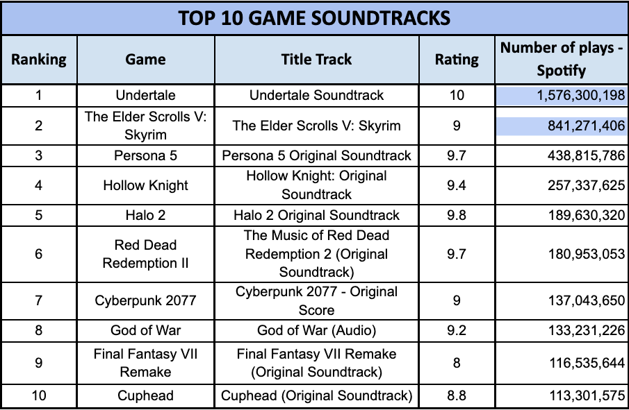 Key findings: Undertale, with 1.57 billion Spotify plays, tops the list at No. 1. The Elder Scrolls V: Skyrim comes in second with 841 million plays, followed by Persona 5 (third, at 438 million plays), Red Dead Redemption II (sixth, at 180 million plays), and Cuphead (rounding out the list, at 113 million). The rankings underscore the diversity of gaming soundtracks: from jazz and funk to rock and folk genres.