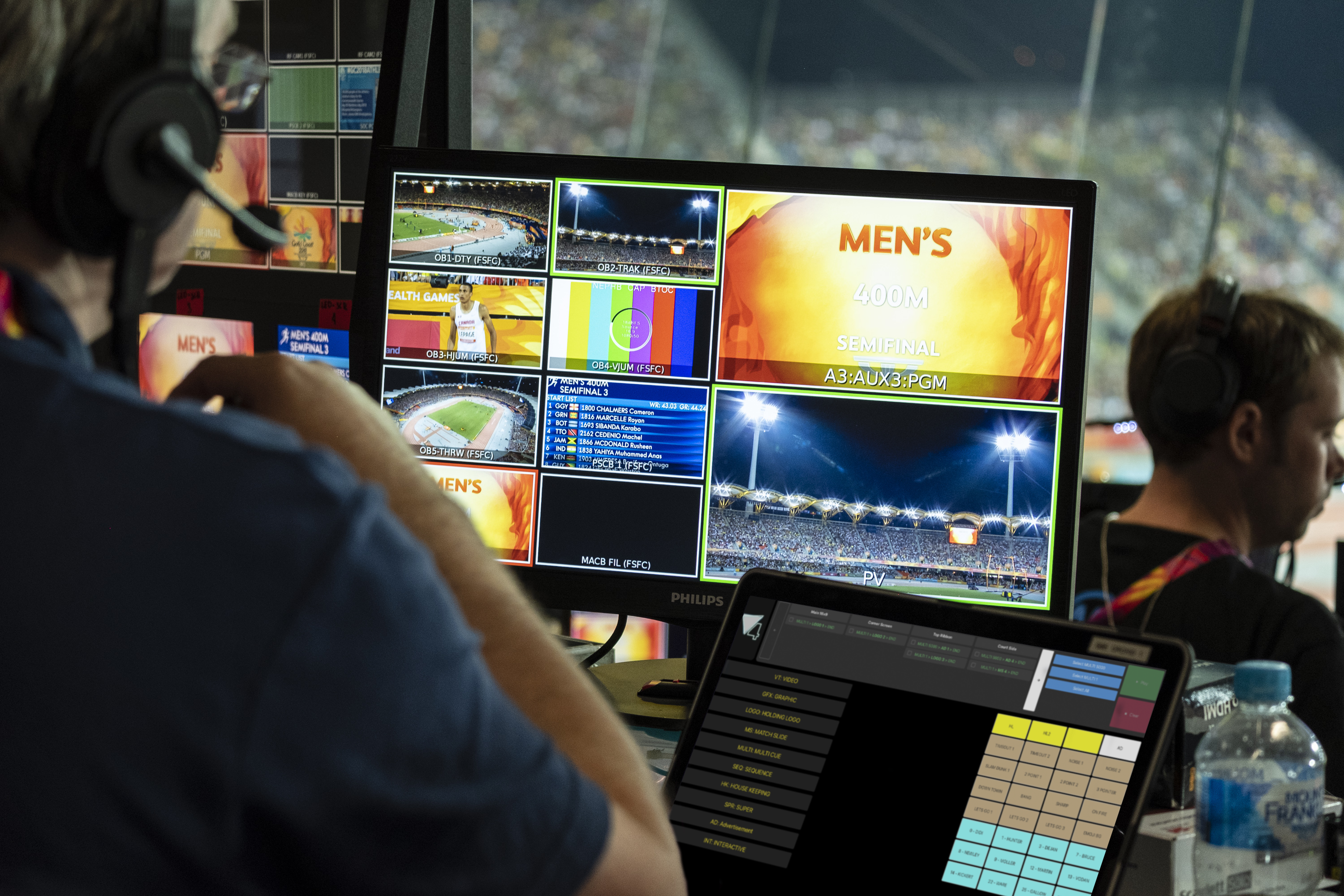 Horton: It’s a very good point because these events taking place in the same stadium are produced differently. There’s one broadcast feed for Rugby Sevens but five broadcast feeds of the various events going on in Track & Field. We have to get in sync with [these broadcast feeds] and w ork together , so our show callers and production team in the control room are communicating with competition management. This helps with understanding the timing of each individual event and knowing if something needs to be held up. If there’s a false start on a race, we’ll have time to update on a field event as that race gets reset. It’s a high-intense environment, but it’s important to have a lot of experience in Track & Field, being comfortable with pacing, and being ready to react when something happens.