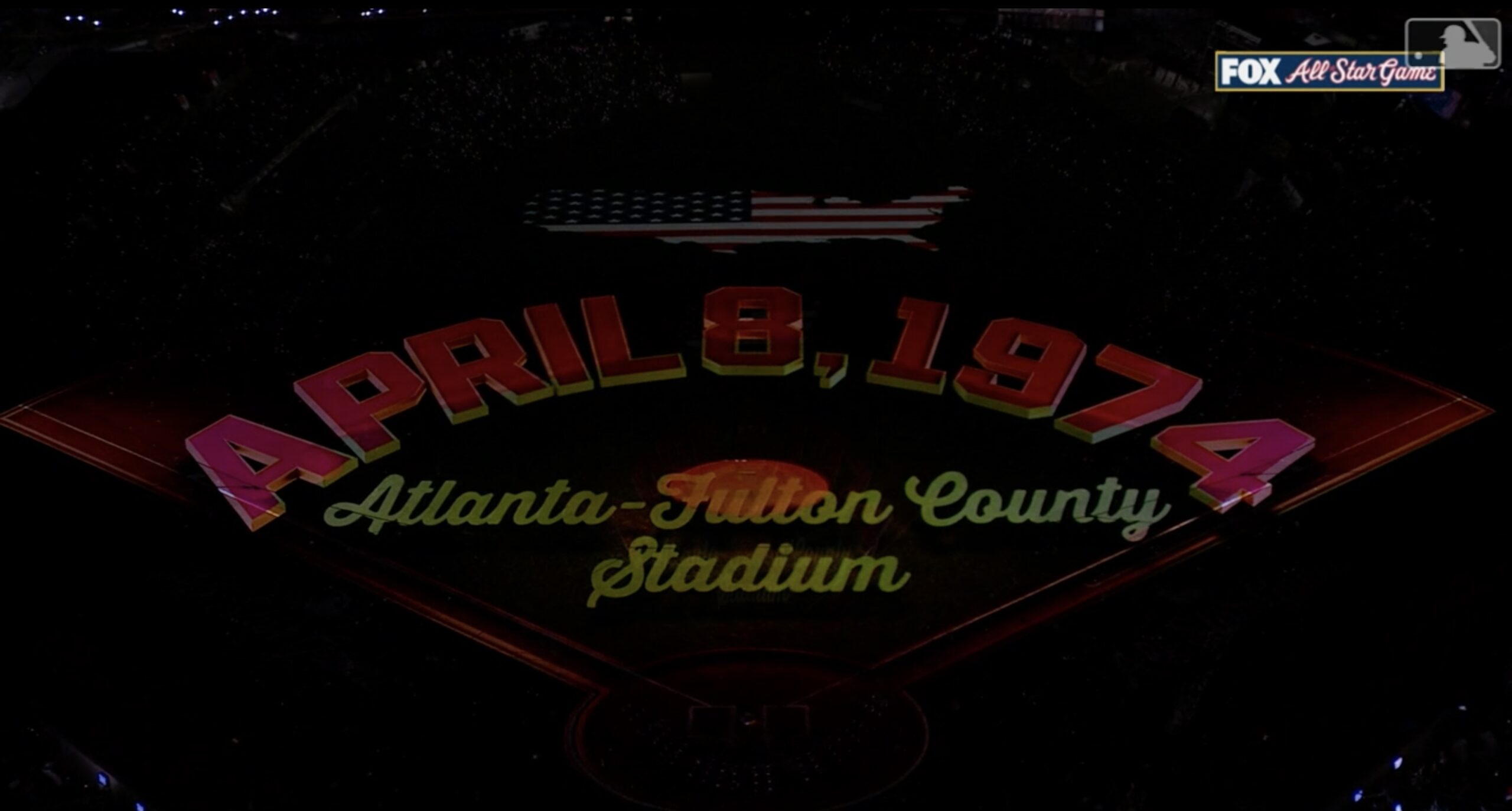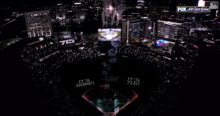 In a way similar to how Tupac Shakur was “resurrected” for the 2012 Coachella music festival with a carefully choreographed projection, Aaron’s 715th was re-created during the 6th inning of the All-Star Game on FOX Sports via a massive 3D projection that covered most of Truist’s playing area.