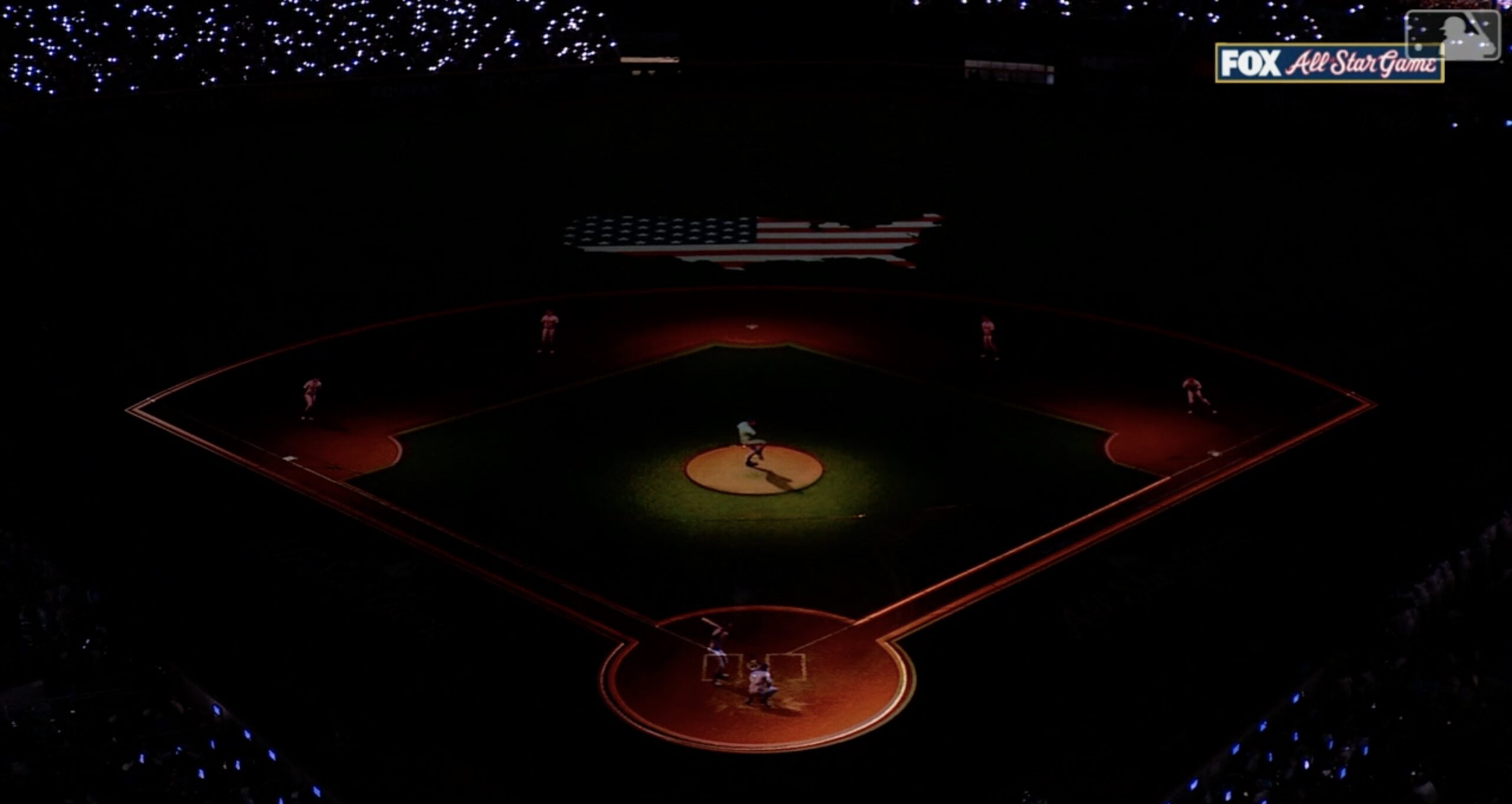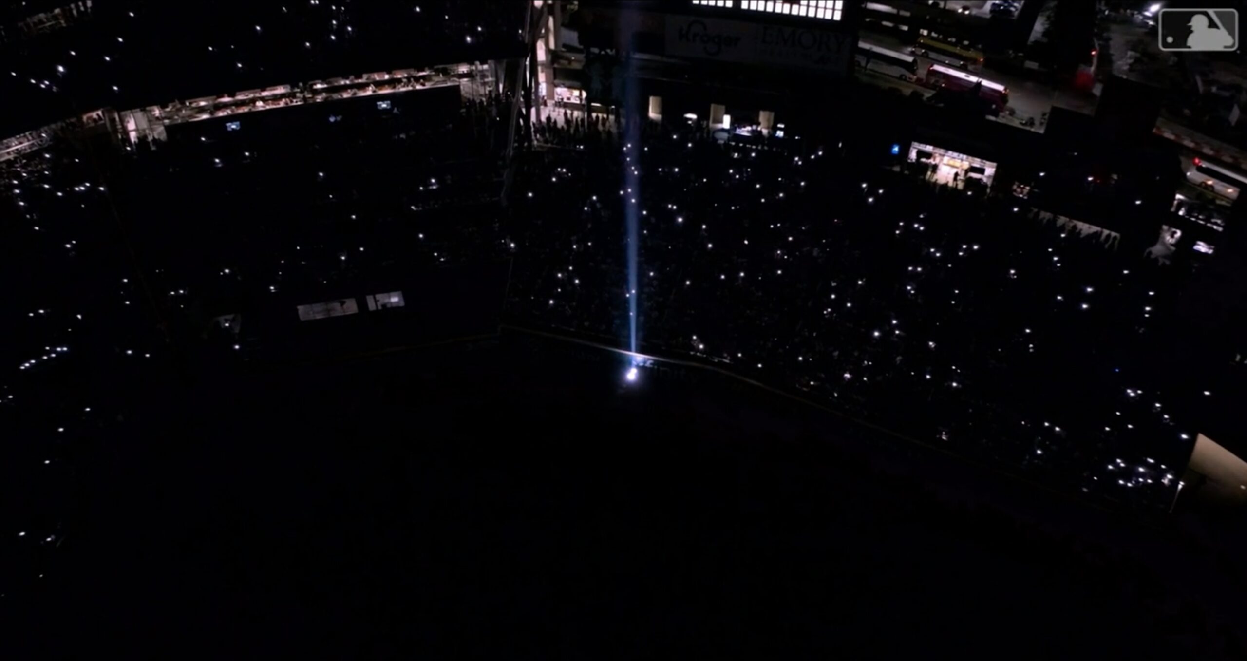 The lights went down as fans held their cellphone lights aloft. Footage from the scene on April 8, 1974, at the old Atlanta–Fulton County Stadium was projected on the infield and shown on the videoboard. When Aaron’s momentous swing took place, an animated three-dimensional baseball moved “forward” and filled the scene. The tableau shifted to real life with a blazing fireball launched from home plate to signify the homer that pushed him past Babe Ruth’s record 714. Content then shifted to the stadium’s main LED display even as it filled home viewers’ screens, culminating in a pair of 7,000-W upward-firing xenon lamps signifying where near the left-center seats the ball had ultimately landed in the old Fulton County Stadium.