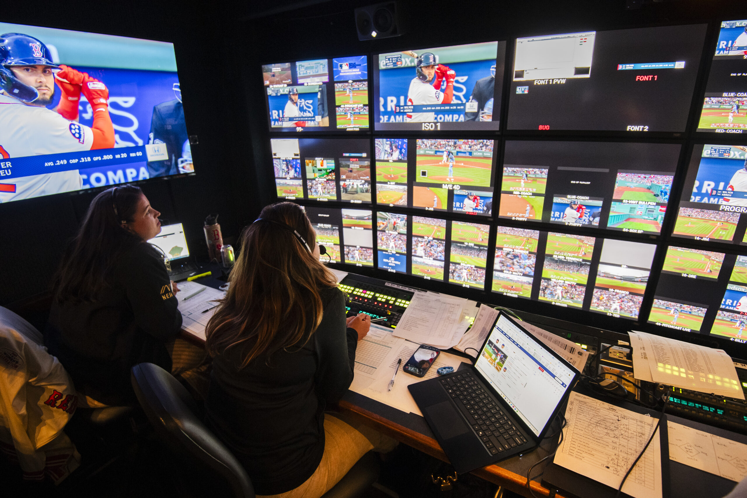 From left: Anna Gregoire and Amy Kaplan produce NESN’s broadcast of a game between the Boston Red Sox and the Kansas City Royals at Fenway Park on Tuesday night. (Photo: Clay Stark/Boston Red Sox)