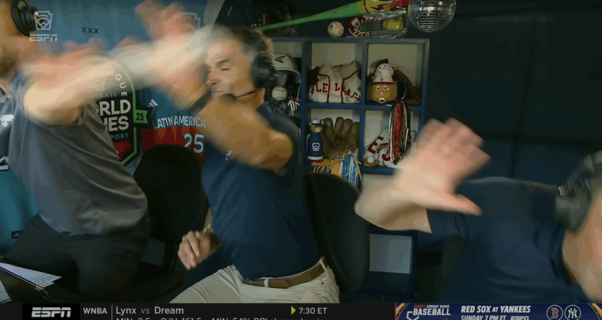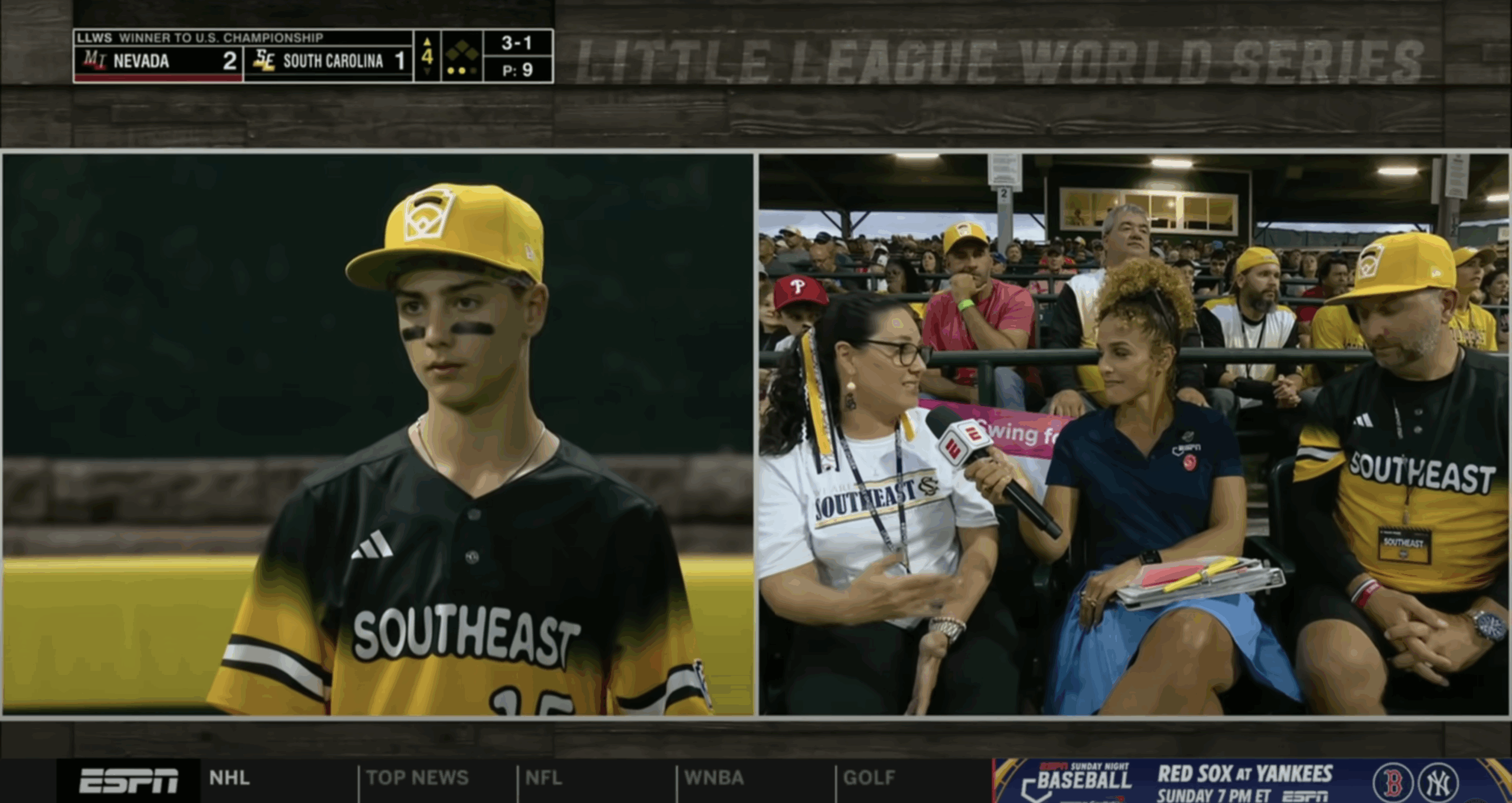 ESPN’s Sunday Night Baseball was bought in as well. Analysts Eduardo Perez and David Cone called the morning games of the LLBWS prior to their assignment of the nightcap between the New York Mets and Seattle Mariners at Journey Bank Ballpark at Bowman Field. Play-by-play announcer Karl Ravech did all three games of the amateur tournament before heading to the home of the Williamsport Crosscutters. This was coordinated alongside SNB coordinating producer Scott Gustafson and producer Andy Jacobson.
