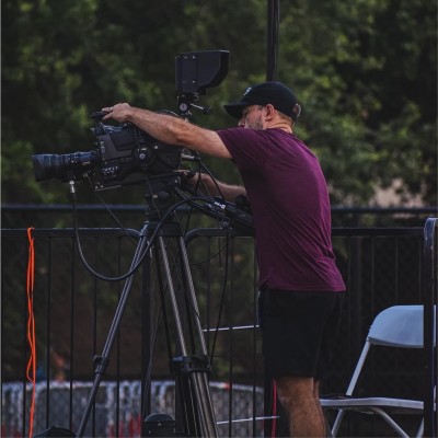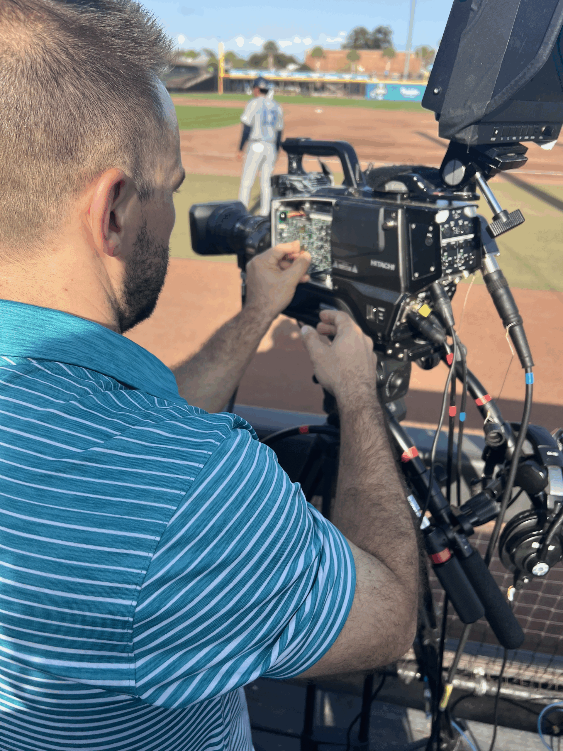 Souza fixes a camera during a Coastal Carolina baseball broadcast.