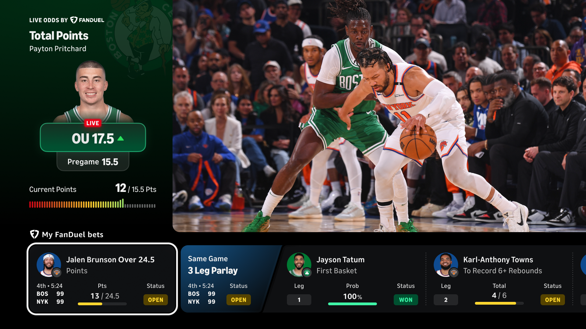 Prime is also debuting an opt-in personalized bet tracking experience with FanDuel. Once a user links their FanDuel account, active wagers and outcomes are surfaced directly in the broadcast. An immersive “Odds View” mode adds live lines, props, and probabilities for those seeking deeper betting context. Importantly, all betting features are optional and framed around responsible gaming principles.