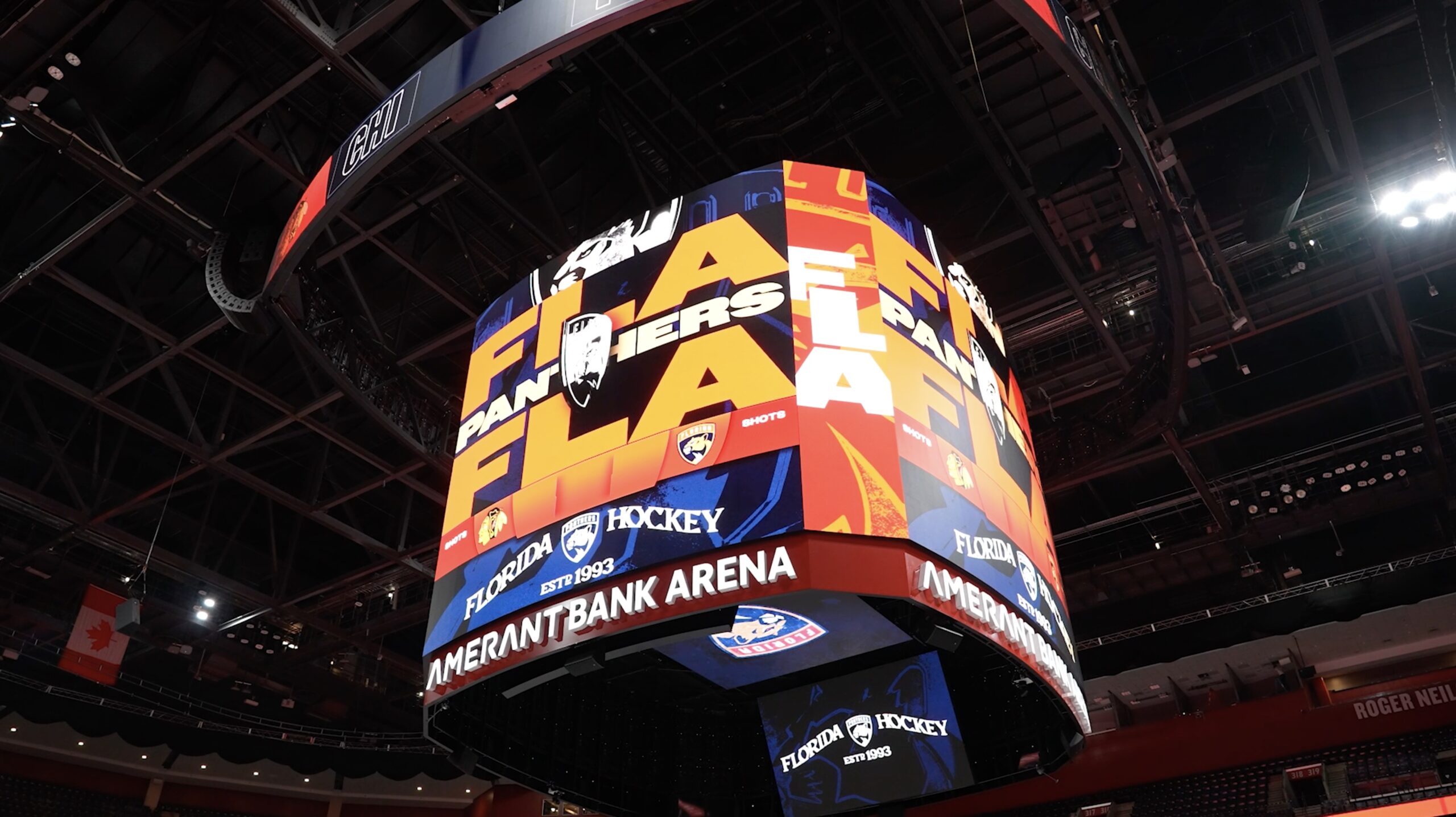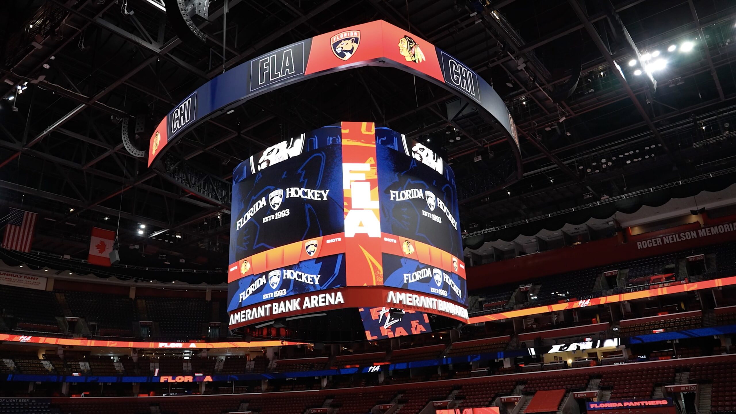 Florida Panthers start their NHL title defense with a new centerhung videoboard at Amerant Bank Arena.