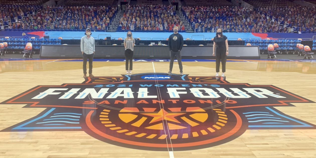 Chalfant (far right) at the 2021 NCAA Women’s Basketball National Championship Game “bubble” at the Alamodome in San Antonio, TX, with (from left) Lindsay (Hayden) Elliott, Carson Kenny, and David Quintanilla