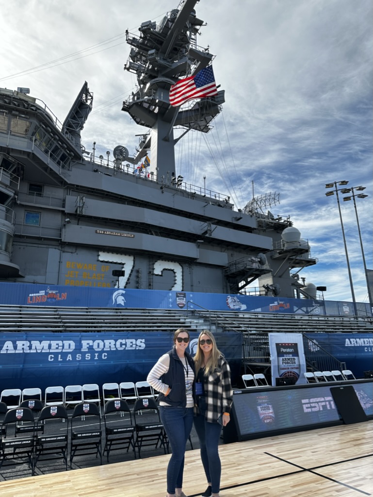 Chalfant at the 2022 Armed Forces Classic aboard the USS Abraham Lincoln in San Diego with Abby Hurlbert, supervisor, remote operations, ESPN.