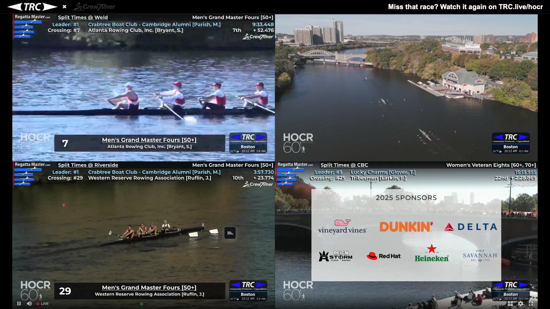 The TRC team sent live feeds to NBC10 Boston, which also livestreamed races throughout Saturday and Sunday, and the Head Of The Charles Regatta YouTube channel.