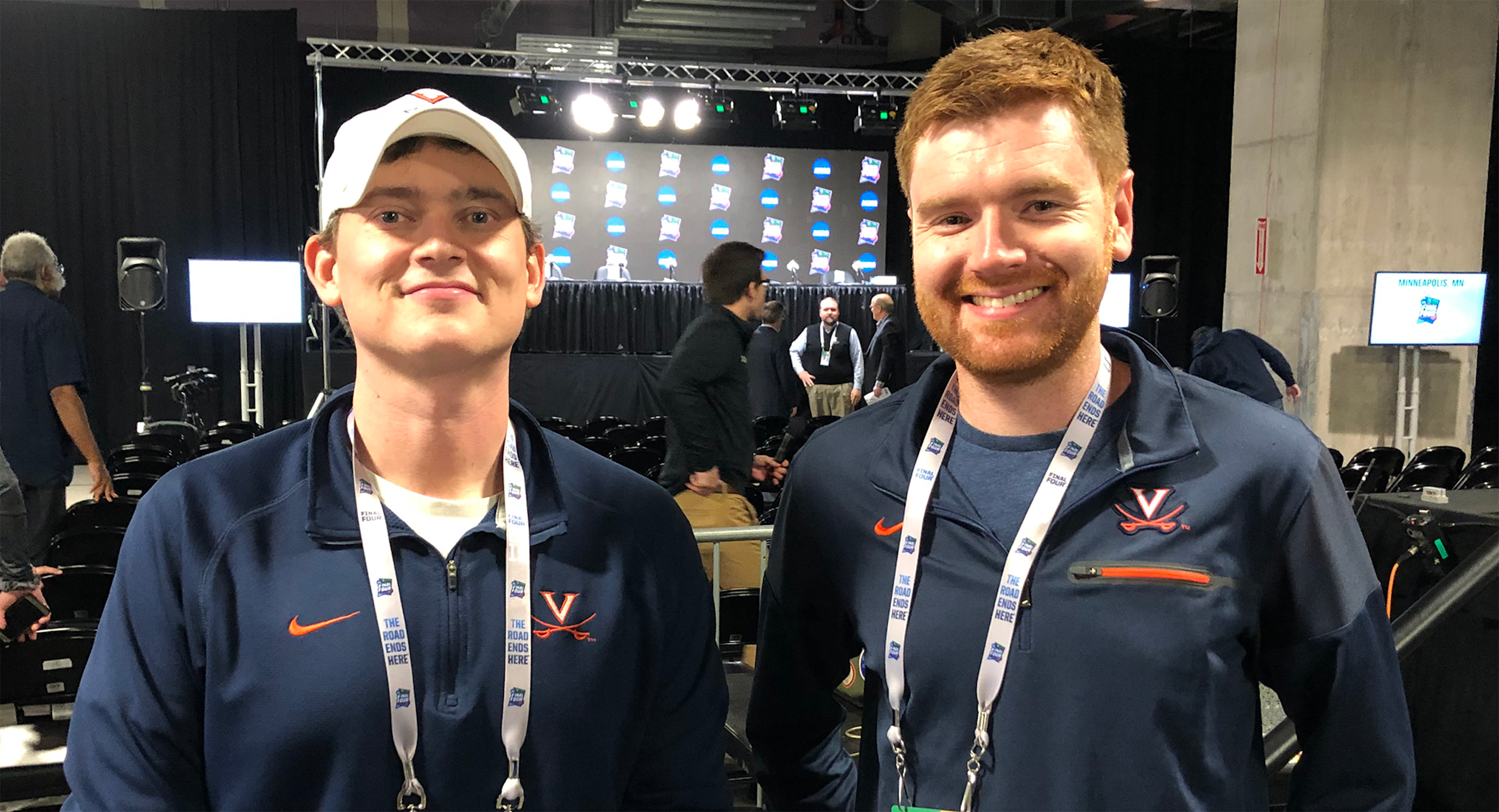 Szlamowicz at the 2019 NCAA Men’s Basketball Final Four in Minneapolis with Ryan Mahanes (left), who is now assistant athletics director, creative services and digital strategy, University of Virginia Athletics