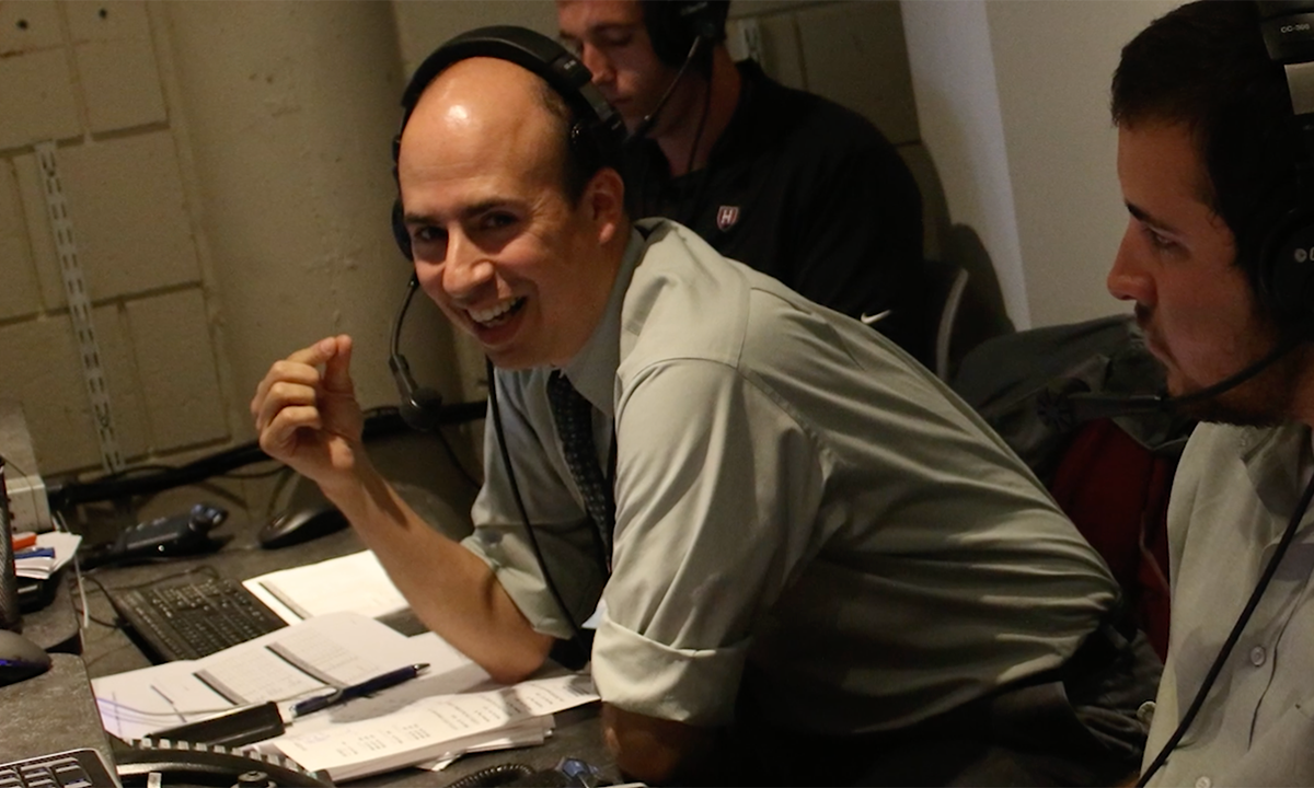 Halevi has been a fixture of the Harvard athletic department since 2012. Here, he directs a broadcast from the athletic department’s control room in 2015.