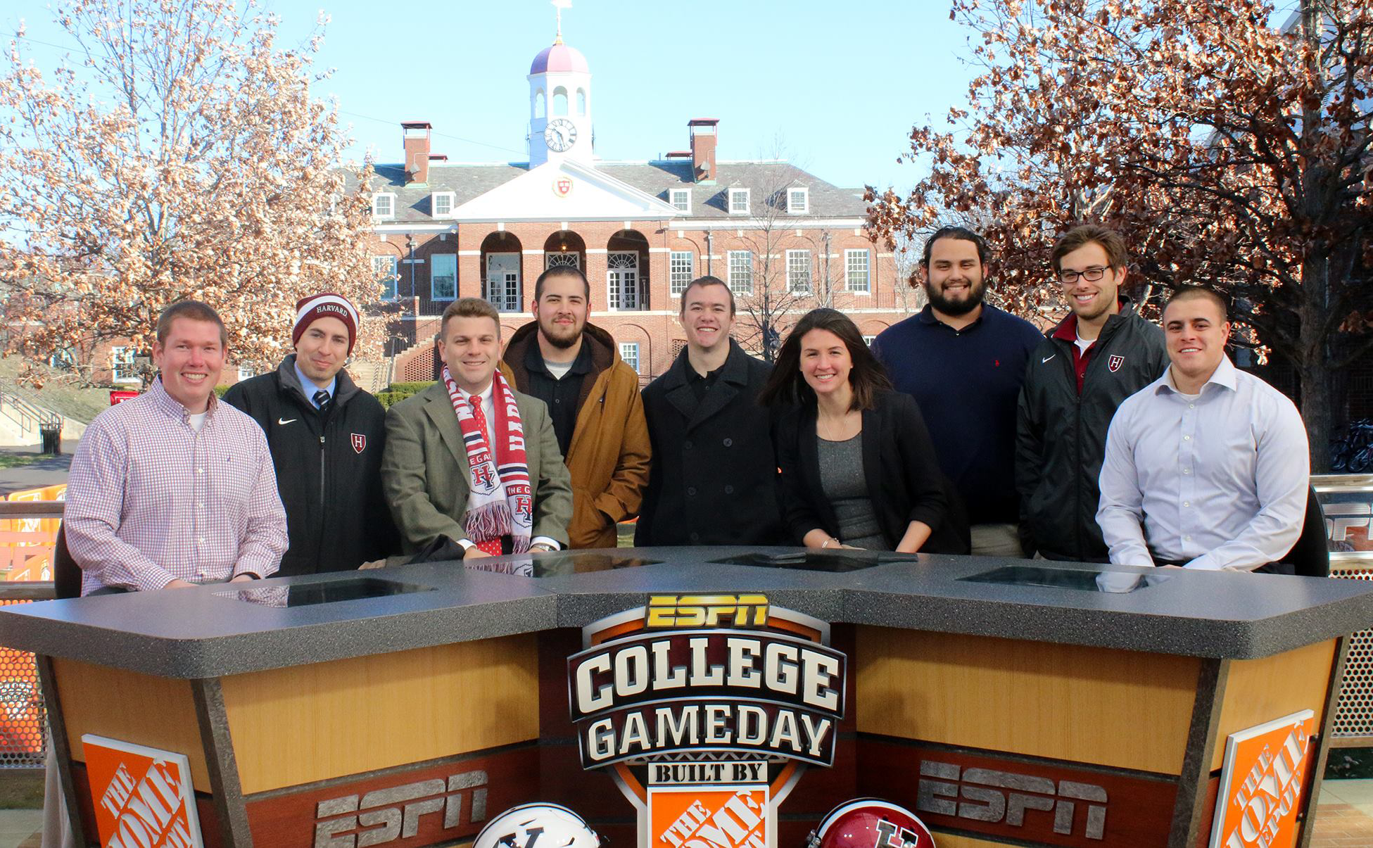 In 2015, ESPN’s College GameDay visited the Harvard campus: (from left) Andy Chesebro, Halevi, Tim Williamson, Jake Dauzat, Zach Reynolds, Alli Fossner, Achilles Carmenate, Ryan Christiansen, Brock Malone.