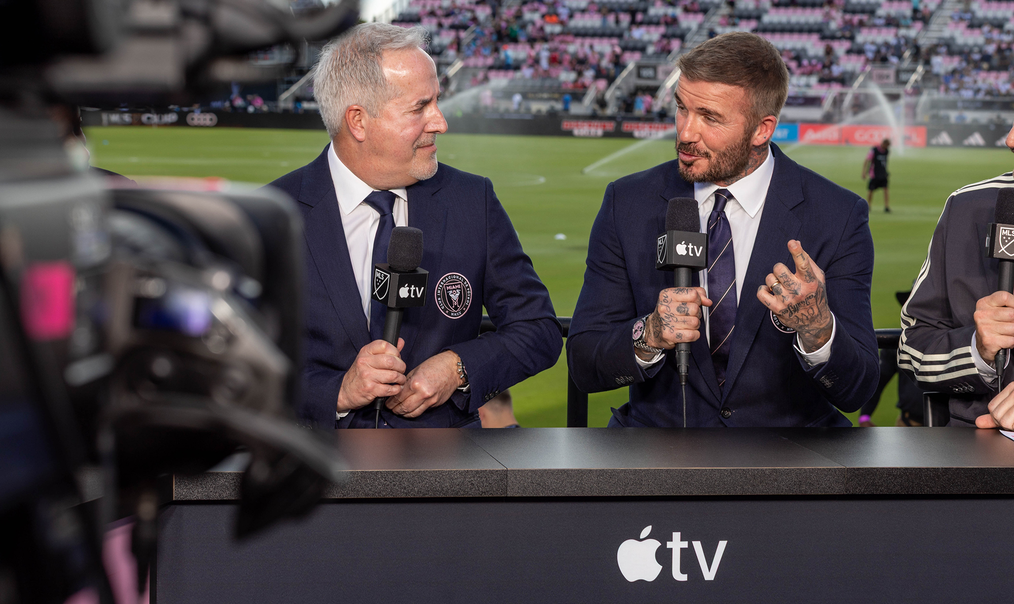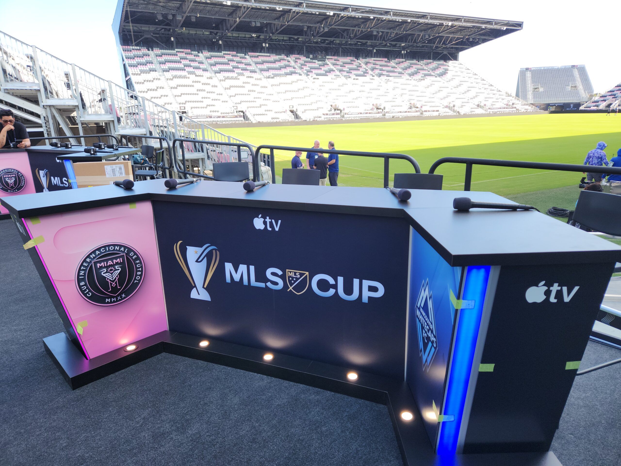 MLS and Apple have rolled out their English- and Spanish-language studio shows at Chase Stadium. One corner of the field has been cordoned off, and two elevated platforms have been erected to serve both shows for pre/postgame and halftime broadcasts. Fox Sports also has an on-field set for its shows.