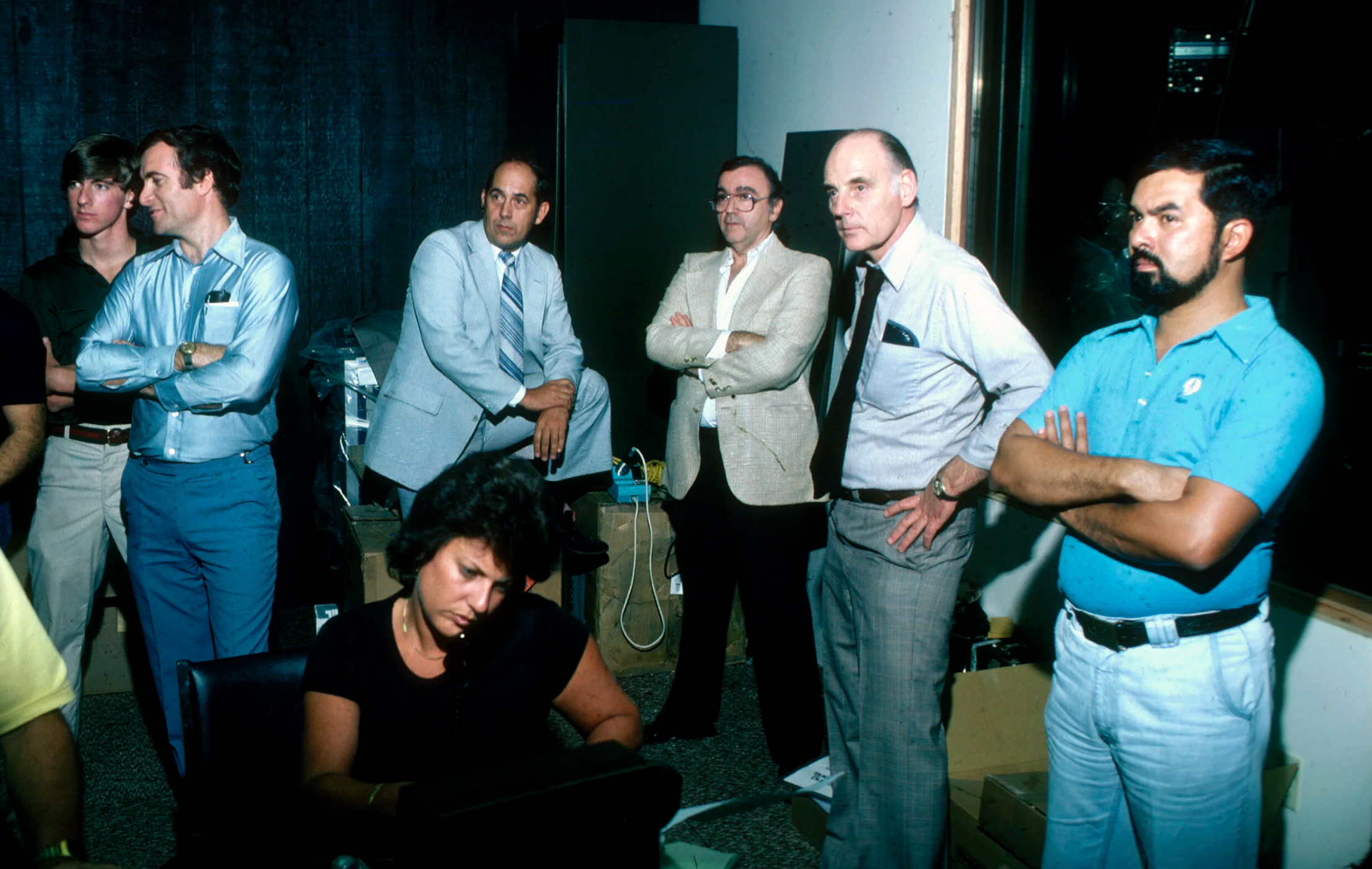 Inside the control room during the launch of ESPN in September 1979: Rasmussen (third from left) is joined by Sports Broadcasting Hall of Famers Chet Simmons (center) and Scotty Connal (second from right) and other members of the team. (Photo: Bill Rasmussen)