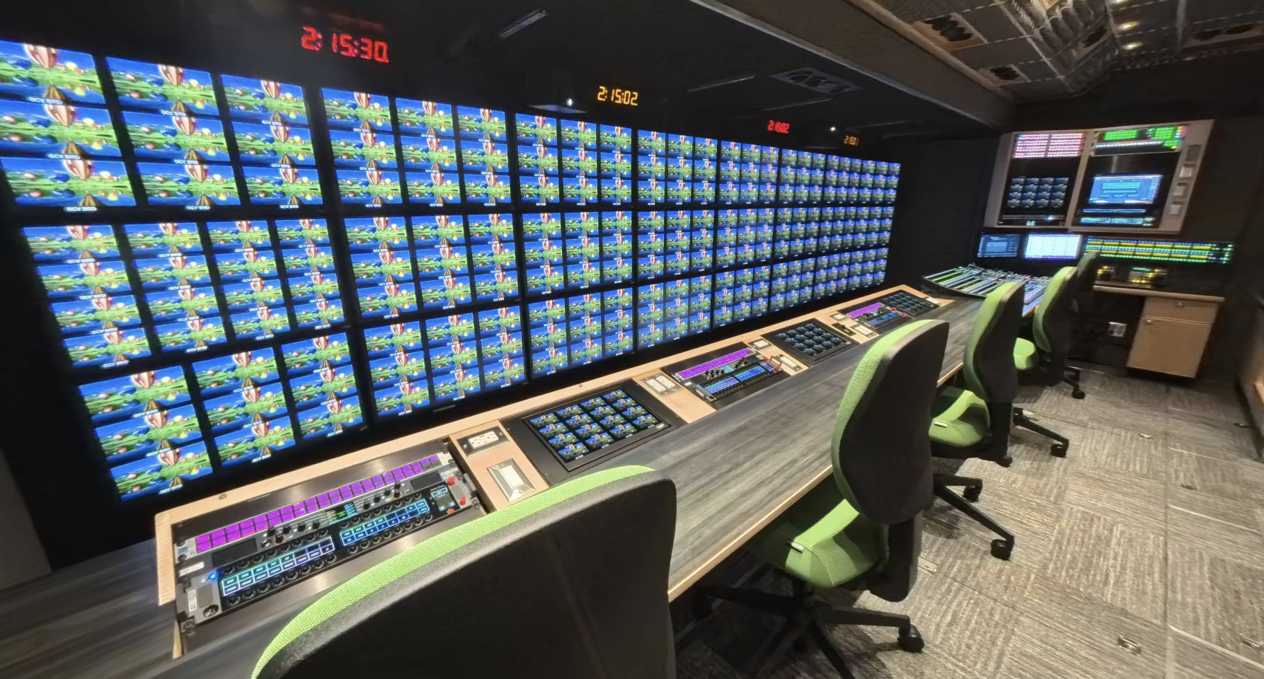 The respective A units house a large engineering room and the video-routing core, an extra-large production room featuring a Grass Valley K-Frame-XP switcher (192×96 via ST2110), and a turned-sideways audio room featuring a Calrec ARGO Q surround-sound console (96×96 analog, 128×128 waves, 16384×16384 ST 2110-30) powered by ImPulse.