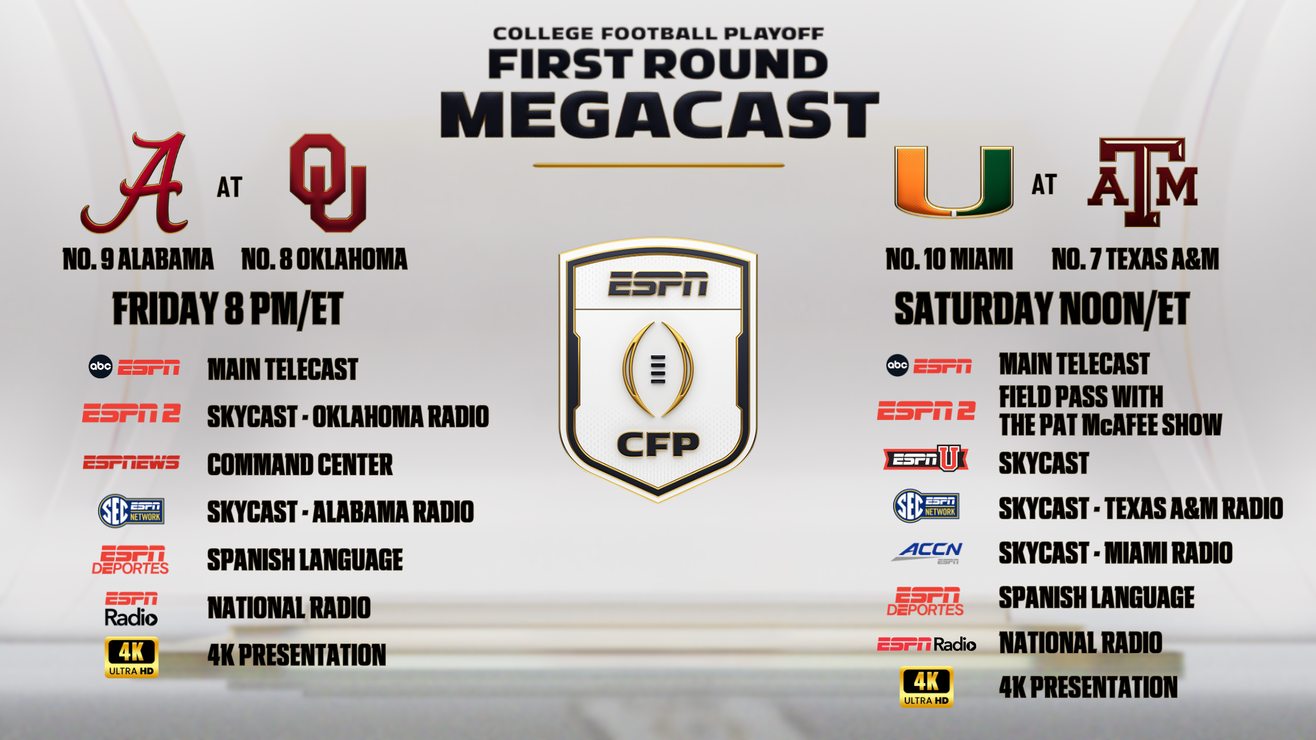 The College Football Playoff First Round opens Friday night with No. 9 Alabama at No. 8 Oklahoma on ABC and ESPN, followed by a Saturday tripleheader featuring No. 10 Miami at No. 7 Texas A&M on ABC and ESPN at noon. Later that day, TNT Sports presents No. 11 Tulane at No. 6 Ole Miss and No. 12 James Madison at No. 5 Oregon at 3:30 and 7:30 p.m. ET, respectively.