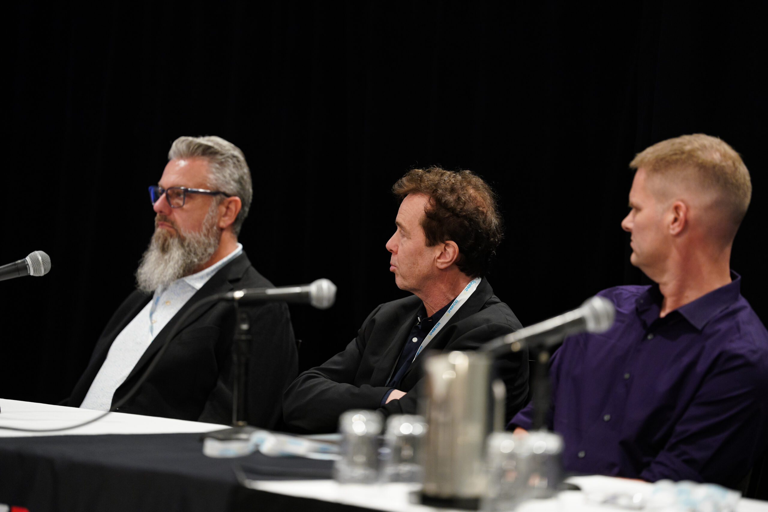 Florian Brown, Sound Supervisor, Karl Malone, NBC Sports and Olympics, Senior Director of Audio Engineering and Ceri Thomas, IMMERSV, Founder during the Perspectives on Live Audio Production and Distribution panel.