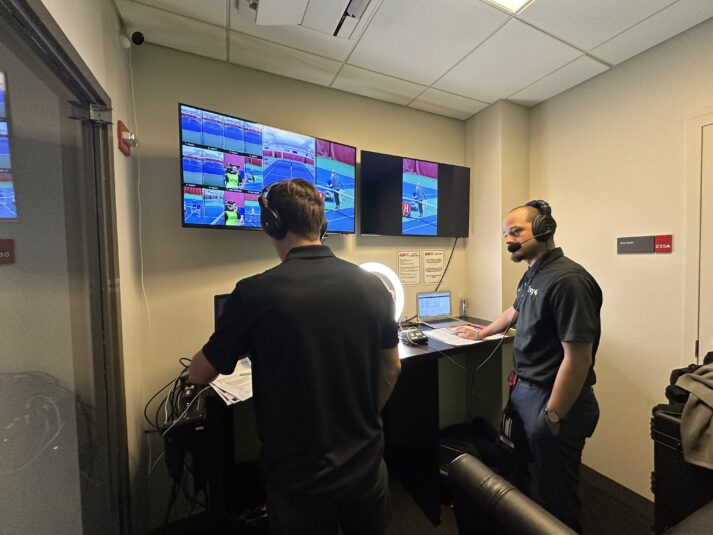 The Harvard tennis broadcast booth helps announcers keep on top of the action.