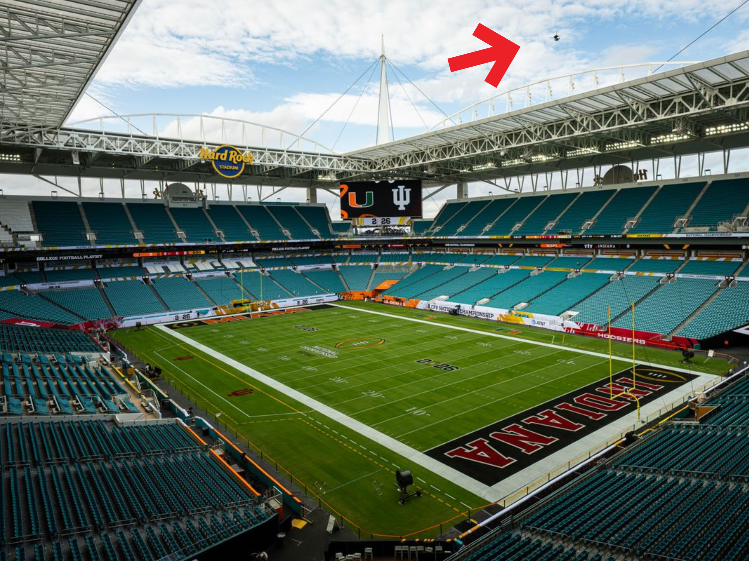 At the 2026 College Football Playoff National Championship Game, ESPN is using the famous spires at each corner of Hard Rock Stadium to add a second, much higher SkyCam to its game-camera arsenal. (Photos: Phil Ellsworth/ESPN Images)