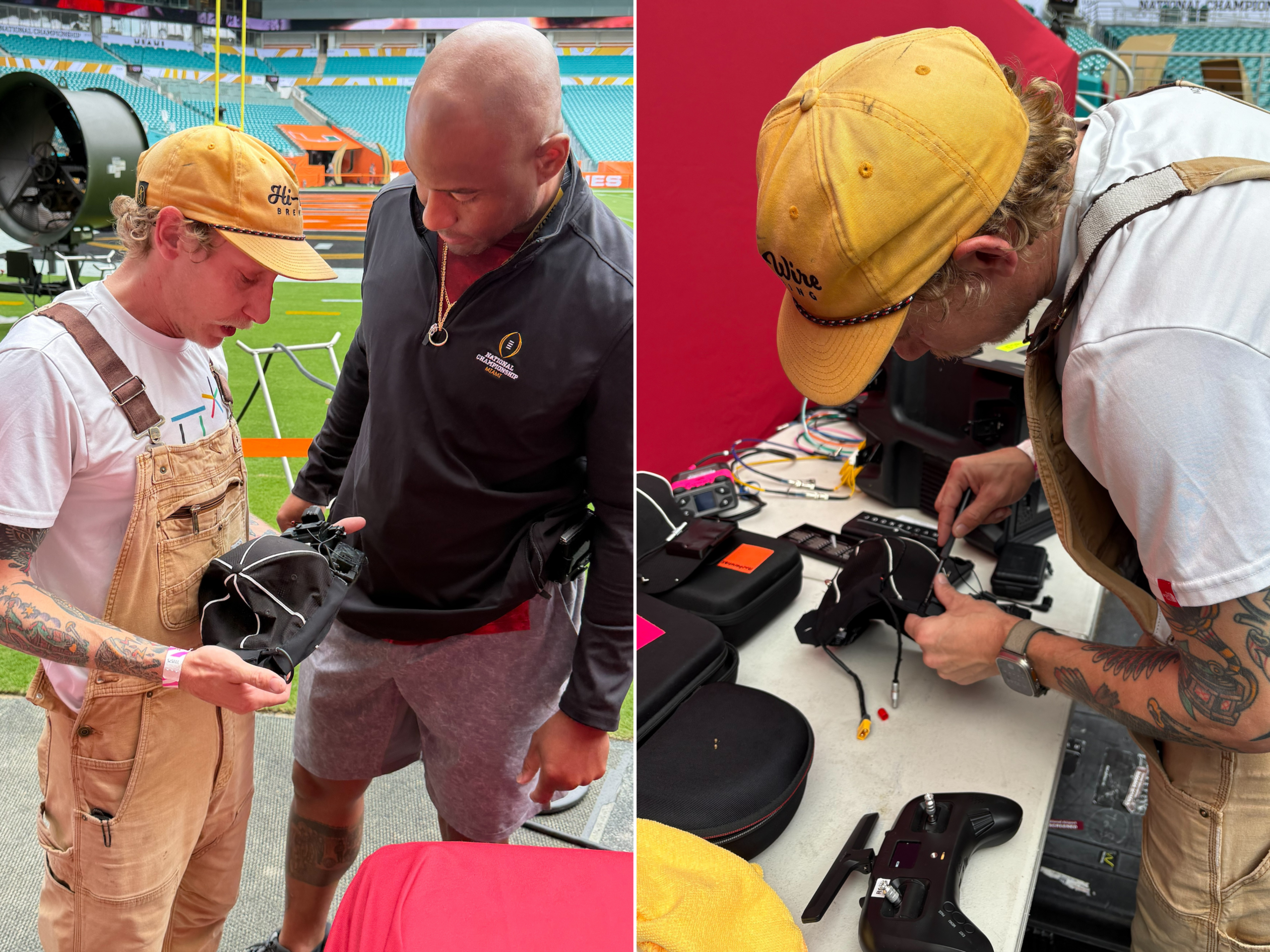 A technician works with a CFP game official on the outfitting of the JockeyCam camera system. The official will wear the POV device on his hat. (Photo: ESPN PR)